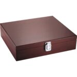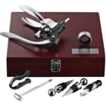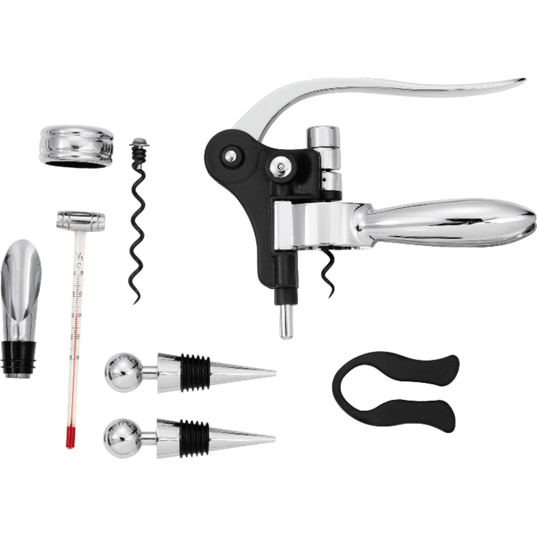 Coffret à vin neuf pièces, présenté dans un coffret en bois de cerisier poli pour un rangement compact. Il comprend un décapsuleur ergonomique, un coupe-capsule, un anneau anti-goutte, un thermomètre, un bec verseur, deux bouchons à vin et deux embouts de tire-bouchon de rechange.