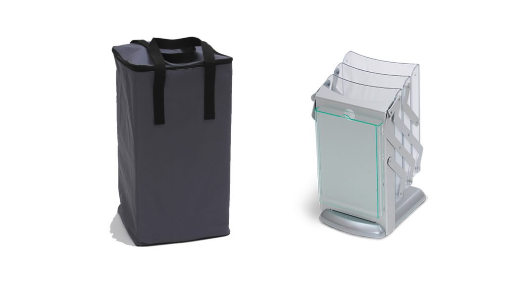 Structure métallique résistante, pied inrayable MDF couleur aluminium, mât en aluminium anodisé, 4 bacs incassables transparents en polycarbonate pour format letter, une housse souple de transport en polyester.